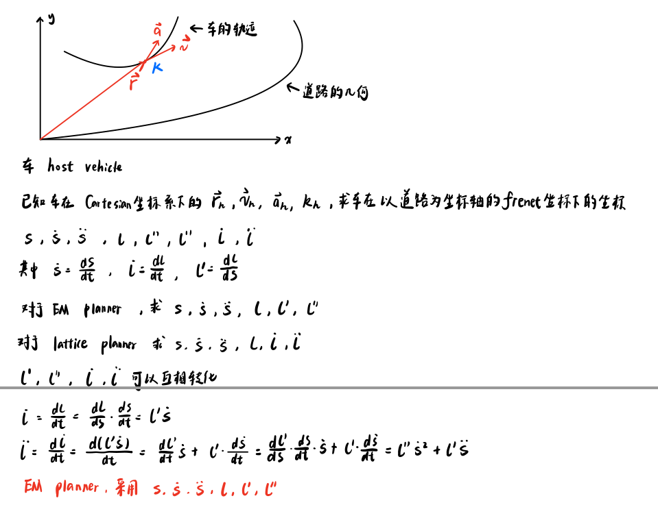 - 将上述全局路径作为在Frenet坐标系中进行局部规划的参考线(即坐标轴),转化至Frenet坐标系后获取自车当前在Frenet坐标系下的坐标;